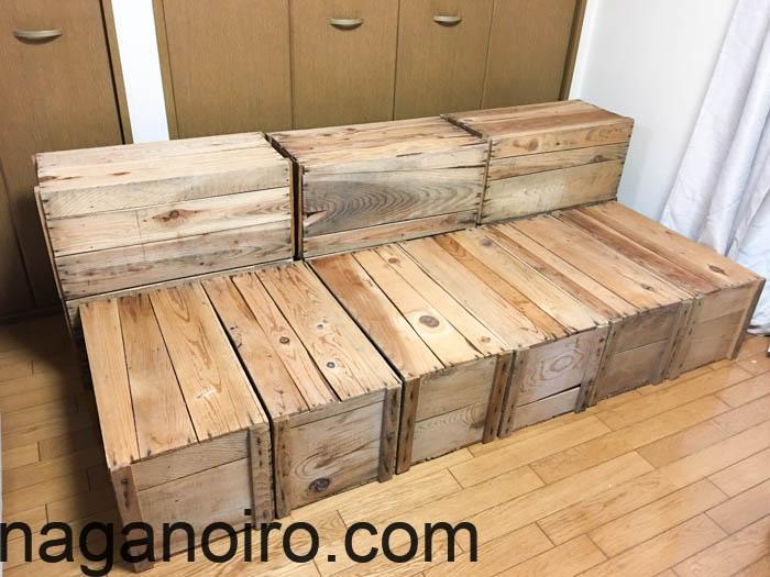 古い木製リンゴ箱をいただいたので、ソファーを作ることにしました。 高さや幅がそれぞれ少し違ったりしますが、古い木の風合いがとってもいい感じ。 実際に農家さんが... -