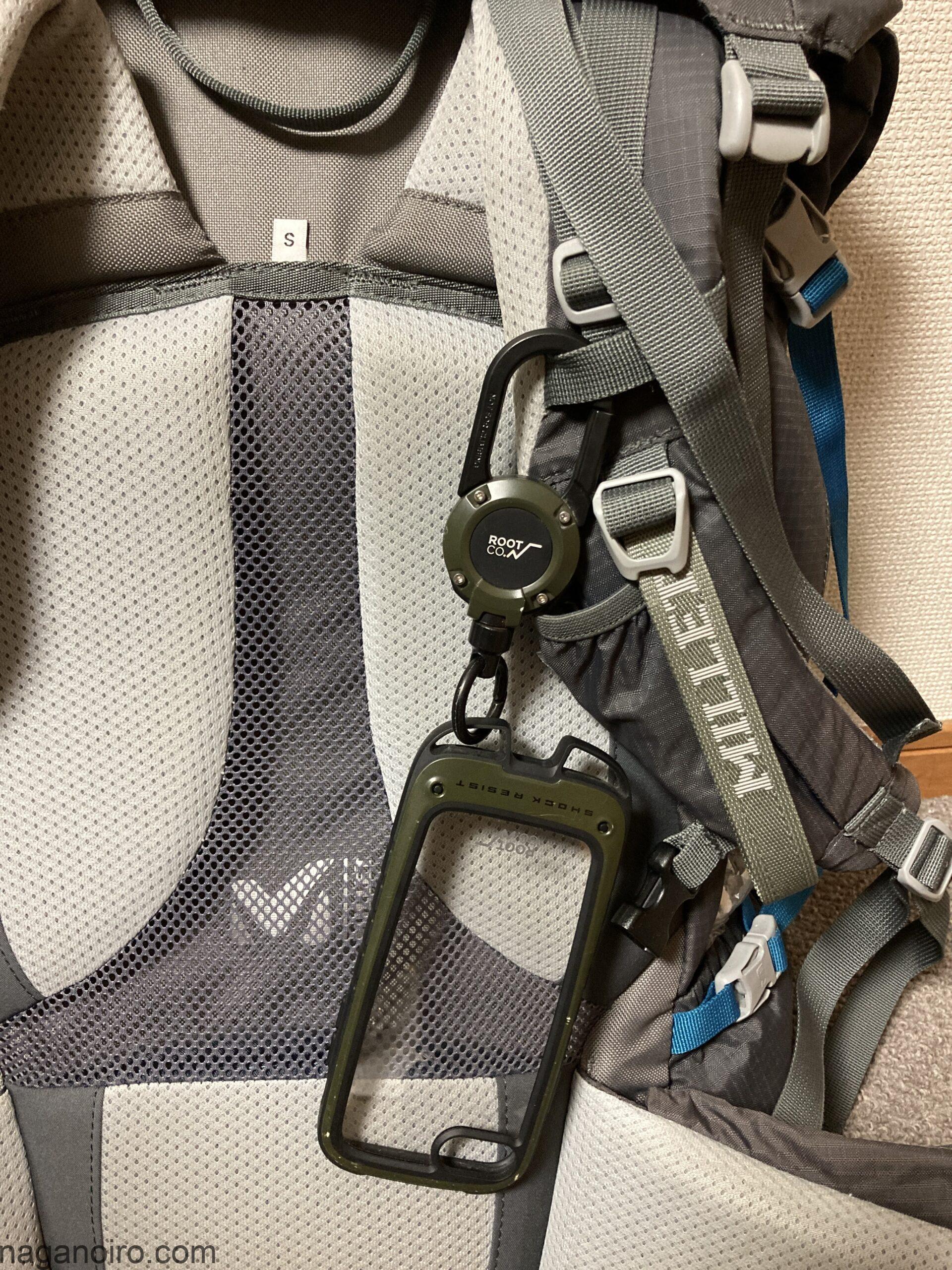 上下がカラビナタイプになっていて、バックパックやベルトループなどにワンタッチで脱着できる。マグネットリールなので落とす心配もなくて安心です。