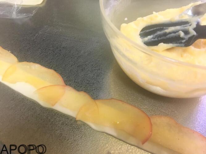 パイシートの上にカスタードを塗り、りんごを少し重なるようにして並べ、端から巻いていきます。