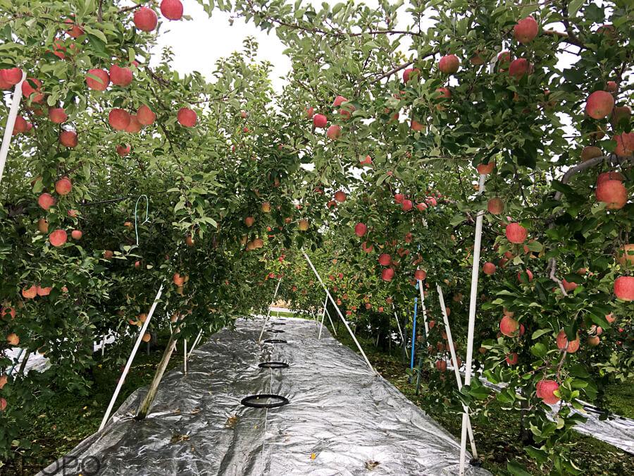 太陽の光を乱反射させて、りんごにまんべんなく当ててあげ、色づきを良くします。モモの樹でも敷きますが、敷く期間が短く収穫前の2週間程度に対し、サンふじの場合は約1か月と長い。りんごはじっくり色づかせるんですね。