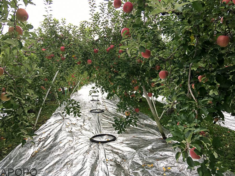 シルバーシートを敷いた状態。このシートに太陽光が当たり反射させてりんごや葉っぱに光をまんべんなく当ててあげる。